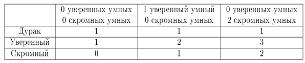 Если было два скромных умных, они ответили: "Один", и ситуация не отличима от первой. Если бы было два уверенных умных, они ответили бы "Два", и ситуация была бы отличима. Наконец, если бы были один уверенный и один скромный умный, то уверенный ответил бы "Два", и ситуация также была бы отличима.