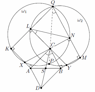Пусть Q – точка пересечения прямых KL и MN. Поскольку ∠QLC = ∠NMY = 90°, четырёхугольник QLYM – вписанный. Аналогично четырёхугольник QNXK – вписанный. Тем самым, Q – вторая точка пересечения описанных окружностей ω1 и ω2 треугольников KXN и LYM соответственно.