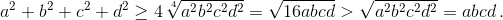 1) abcd ≥ 16. Тогда по неравенству между средними квадратичным и арифметическим a² + b² + c² + d² ≥ 4(a+b+c+d/4)² ≥ 4(abcd/8)² = 1/16 (abcd)² ≥ abcd. 2) abcd < 16. Тогда