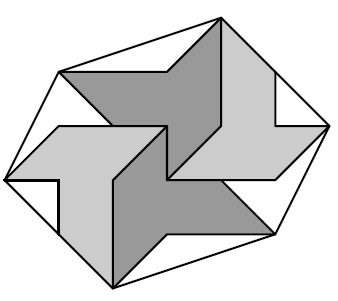 Предложенные вам четыре одинаковые фигуры (рис. слева) требуется уложить в шестиугольник (рис. справа) так, чтобы они не выступали за его границы и не накладывались друг на друга (даже частично).