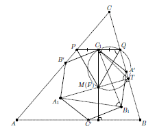 ∠A1MB1 = 180° – γ, где α, β и γ – углы треугольника ABC (эти углы меньше 120╟, потому что F лежит внутри треугольника ABC; отсюда и следует, что точка M лежит внутри треугольника A1B1C1). Пусть прямые, проходящие через A', B' и C' и перпендикулярные A1M, B1M и C1M, образуют треугольник ABC (см. рис.). Очевидно, что он подобен данному треугольнику. Значит, осталось показать, что AA1, BB1 и CC1 являются его медианами, а M – точкой Торричелли (то есть M совпадает с F).
