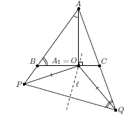 Поскольку ∠A1AP = 90° – ∠ABC = 90° – ∠AQP, луч AA1 проходит через центр O описанной окружности треугольника APQ (см. рис.). Этот центр также лежит на серединном перпендикуляре l к отрезку PQ. Поскольку AB ≠ AC, прямые AO и l не параллельны. Но и O и A1 являются их общими точками; значит, A1 совпадает с O. Следовательно, вписанный угол PAQ равен половине центрального угла PA1Q.
