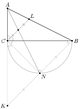 В треугольнике ABC угол C прямой. На катете CB как на диаметре во внешнюю сторону построена полуокружность, точка N – середина этой полуокружности. Докажите, что прямая AN делит пополам биссектрису CL.
