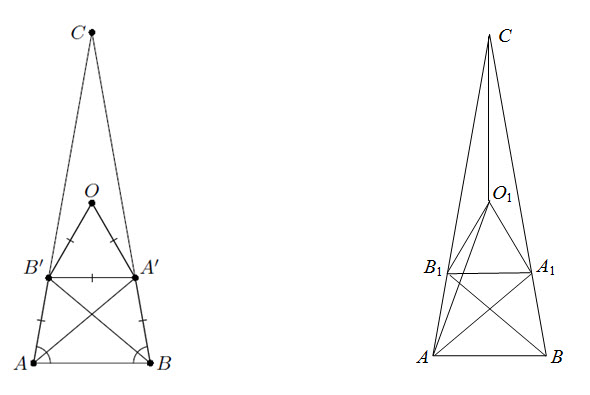 ∠A'BB' = ∠A'B'B = ∠ABB' (рис. слева). Следовательно, точка B' совпадает с B1. Аналогично A' совпадает с A1, что и требовалось.