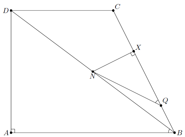 Пусть X, Y – проекции точек N и M на BC. Тогда утверждение задачи равносильно равенству RY = XQ. Заметим, что треугольник ANB – равнобедренный (AN – медиана прямоугольного треугольника BAD). Так как ∠NQX = ∠NAB = ∠DBA (см. рис.), то