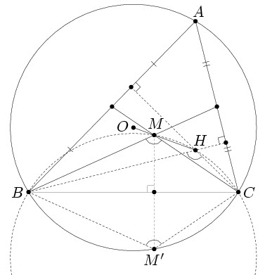 По условию описанная окружность ω треугольника ВМС, симметрична Ω относительно прямой ВС, поэтому ортоцентр Н треугольника ABC лежит на ω (см. задачу 155463). Кроме того, точка М лежит на отрезке ОН (см. задачу 155595). При этом точки О, М и Н попарно различны, так как треугольник АВС – не равносторонний. Следовательно, точка О лежит вне ω.