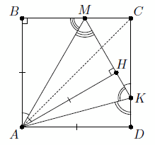 Из условия следует, что ∠BMA = ∠CMK = 60°, а тогда и ∠AMK = 60° (рис. слева). Далее можно рассуждать по-разному. Первый способ. Пусть AH – перпендикуляр, опущенный из вершины A на MK. Тогда прямоугольные треугольники AMB и AMH равны по гипотенузе и острому углу, откуда AH = AB. Если точка H лежит на отрезке MK, то прямоугольные треугольники AKH и AKD равны по гипотенузе и катету. Следовательно, ∠AKD = ½ ∠MKD = 75°.