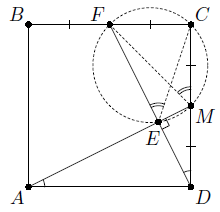 Точка F – середина стороны BC квадрата ABCD. К отрезку DF проведён перпендикуляр AE. Найдите угол CEF.