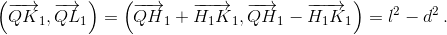 Пусть O1 и O2 – центры данных окружностей, P – середина отрезка O1O2, Q – основание перпендикуляра, опущенного из P на одну из данных прямых, H1 и H2 – середины высекаемых этой прямой хорд K1L1 и K2L2 длины 2d. Тогда Q – середина отрезка H1H2 (так как отрезок O1O2 проектируется на H1H2). Пусть OH1 = OH2 = l. Степень точки Q относительно первой окружности равна