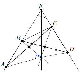 В выпуклом четырёхугольнике ABCD лучи AB и DC пересекаются в точке K. На биссектрисе угла AKD нашлась такая точка P, что прямые BP и CP делят пополам отрезки AC и BD соответственно. Докажите, что AB = CD.