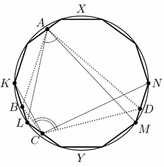 Если же наше предположение неверно, то отмеченные точки образуют выпуклый четырёхугольник ABCD, "достаточно близкий" к вписанному. Именно, покажем, что ∠A + ∠C ≥ 180° – 360°/n. Пусть точки B и C лежат на сторонах KL и MN многоугольника P, причём точки A, K и N лежат по одну сторону от BD (см. рис.).