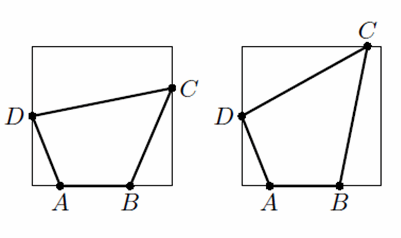 1) ∠B ≥ 90°. Тогда ясно, что ABCD можно вписать в квадрат так, чтобы точки A, B попали на одну из сторон – одним из способов, изображённых на рисунке, в зависимости от того, что больше: проекция CD на AB или проекция ABCD на прямую, перпендикулярную AB).
