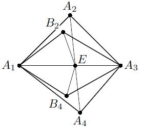 B1 = A1, B3 = A3; при этом A1A2 > A1B2, A2A3 > B2A3, A3A4 > A3B4, A4A1 > B4A1. Пусть E – точка пересечения диагоналей A1A3 и A2A4; тогда по лемме A2E > B2E, A4E > B4E и, следовательно, A2A4 = A2E + A4E > B2E + B4E > B2B4. Противоречие.