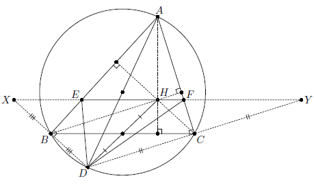 Пусть X и Y – точки пересечения прямых BD и CD с прямой EF (см. рис.). Как известно (см. задачу 208949), точки D и H симметричны относительно середины стороны BC. Отсюда следует, что BC – средняя линия треугольника XYD. Заметим, что углы ABD и ACD – прямые. Поэтому XE = DE,