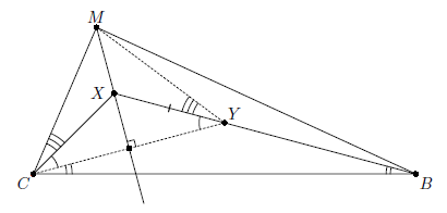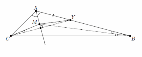 ∠XCB = 30° + ∠XBC, то чтобы выполнялось условие, угол MBX должен быть на 15° больше угла MCX. Треугольник CMY – равнобедренный, следовательно, ∠MCX = ∠MYX > ∠MBY, то есть такое расположение точек невозможно.
