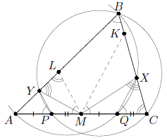 Решение 1: Из вписанности четырёхугольников BCPY и BAQX следует, что ∠APY = ∠ABC = ∠CQX. Пусть прямая, проходящая через M параллельно QX, пересекает прямую BC в точке K, а прямая, проходящая через M параллельно PY, пересекает прямую AB в точке L. Тогда ∠AML = ∠ABC = ∠CMK, откуда ∠ALM = 180° – ∠LAM – ∠AML = 180° – ∠BAC –∠ABC = ∠ACB. Значит, треугольники MAL и MKC подобны по двум углам.