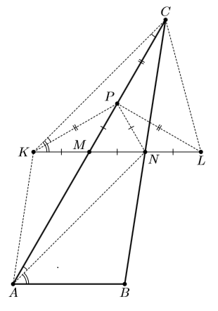 Решение 1:Продолжим отрезок MN на его длину в обе стороны и получим точки K и L (рис. слева). Так как M – общая середина отрезков AC и KN, то AKCN – параллелограмм. Значит, ∠CKM = 45°, ∠KCM = 15°. Отметим на отрезке CM точку P так, чтобы угол CKP был равен 15°. Тогда отрезок KP разобьёт треугольник KCM на два равнобедренных треугольника. Кроме того, ∠PMN = 60°, поэтому треугольник MPN – равносторонний. Треугольники PLN и PKM равны, треугольник CPL – равнобедренный и прямоугольный, CLBM – параллелограмм, следовательно, ∠ABM = ∠CLN = ∠CLP + ∠MLP = 75°.