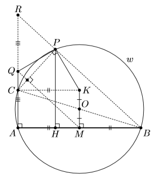 Заметим, что ∠PBA ≠ 90° (иначе PK || AB, и точка Q не существует). Поэтому прямая BP пересекает AQ в некоторой точке R. Треугольники BPH и BRA гомотетичны, так что достаточно доказать, что Q – середина AR. Первый способ. Пусть прямая QA пересекает данную окружность в точке C, отличной от A (рис. слева). По условию отрезки BC и MK делят друг друга пополам, то есть CKBM – параллелограмм. Поскольку M – середина AB, то CKMA – прямоугольник.