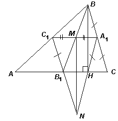 Решение 2:Так как А1С1 || AC, то М – середина отрезка А1С1 (см. рис.). Кроме того, С1В1 = ½ ВС = А1С = А1Н, поскольку НА1 – медиана прямоугольного треугольника ВНС. Таким образом, С1В1НА1 – равнобокая трапеция, откуда следует, что треугольник А1NС1 – равнобедренный. Поэтому его медиана NM является и высотой. Значит, MN ⊥ АС, то есть MN || BH.