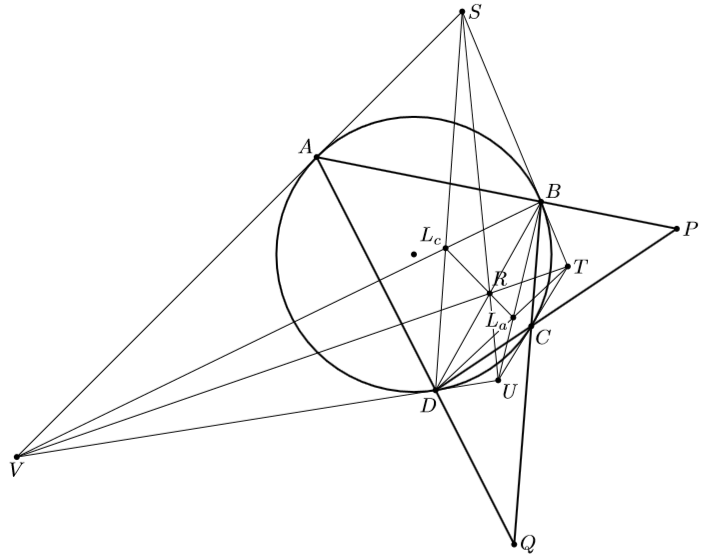 Предположим, что четырёхугольник LaLbLcLd вписанный, но в четырёхугольнике ABCD нет параллельных сторон. Пусть прямые AB и CD пересекаются в точке P, AD и BC – в точке Q, а AC и BD – в точке R (см. рис.). Далее, пусть касательные к окружности в точках A, B, C и D образуют четырёхугольник STUV, как показано на рисунке; некоторые из точек S, T, U и V могут быть бесконечно удалёнными.