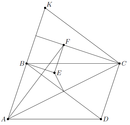 Пусть точка K симметрична A относительно B. Тогда E – центр описанной окружности треугольника ACK. С другой стороны, так как BKCD – параллелограмм, то AF ⊥ CK, то есть F – ортоцентр треугольника ACK (см. рис.). Следовательно, медиана CB делит EF в отношении 1 : 2 (см. задачу 155595).