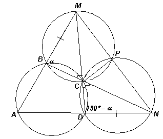 ∠MBC + ∠CDN = 180°, то в результате образуется новый треугольник, в котором равны углы при вершинах С и C', значит, он – равнобедренный. Следовательно, CM = CN. Третий способ. Пусть описанная окружность треугольника ВСМ пересекает MN в точке Р (рис. справа). Тогда ∠NPC = ∠MBC = α, значит, точка Р лежит на описанной окружности треугольника DCN. Так как ВМ = DN и ∠ВСМ = ∠DCN, то радиусы этих окружностей равны. Углы CMN и CNM треугольника МСN опираются на равные дуги этих окружностей, поэтому эти углы равны. Следовательно, CM = CN.