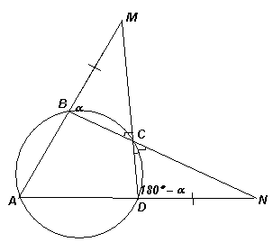 Пусть ∠MBC = α, тогда ∠CDN = ∠ABC = 180° – α (рис. слева). Далее можно рассуждать по-разному.