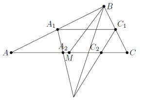 Так как треугольники ABM, CBM – равнобедренные, точки A1, C1 – середины соответствующих катетов. Кроме того, прямая A1A2 перпендикулярна биссектрисе угла A и, значит, является биссектрисой угла AA1C1 (см. рис.). Аналогично C1C2 – биссектриса угла CC1A1. Следовательно, точка их пересечения – центр вневписанной окружности треугольника A1BC1 – лежит на биссектрисе угла B.