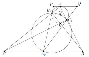 ∠PB1A = ∠CB1A0 = ∠B1CA0 = ∠PAC, и, значит, PA = PB1 (рис. слева). Аналогично QA = QC1. Следовательно, вписанная окружность треугольника A0PQ касается его сторон в точках A, B1, C1, откуда и следует утверждение задачи.