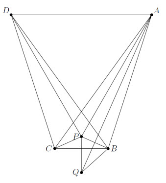 CD = DA = AB. Кроме того, ∠DAP = ∠C + ⅓ ∠A = ⅓ (∠A + ∠B + ∠C) = 60°. Поэтому треугольник ADP – равносторонний и AP = AB. Поскольку AQ – биссектриса угла PAB, то QP = QB = QC (см. рис.).