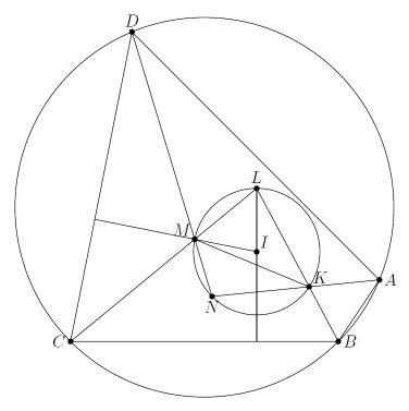 ∠LKM = ½ ∠B – φ/2 = ½ (π – ∠A) = ½ ∠C и, значит, ∠LIM = ∠C. С другой стороны, перпендикуляры, опущенные из точки L на BC и из точки M на CD, образуют с ML углы, равные ½ (π – ∠C), то есть треугольник, образованный этими перпендикулярами и ML, – равнобедренный с углом при вершине, равным углу C. Поэтому вершина этого треугольника совпадает с I. Таким образом, перпендикуляры, опущенные из вершин четырёхугольника KLMN на соответствующие стороны ABCD, проходят через I. Аналогично получаем, что перпендикуляры из вершин четырёхугольника, образованного внешними биссектрисами, проходят через J.