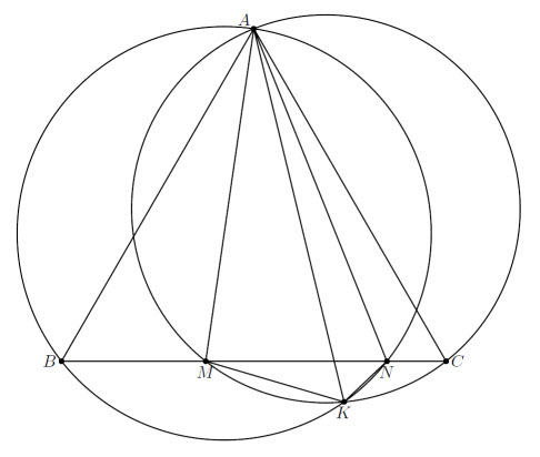 Так как ∠BAM + ∠NAC = ∠MAN и AB = AC, точка L, симметричная B относительно прямой AM, совпадает с точкой, симметричной C относительно прямой AN. Тогда ∠ALM = ∠ABM = ∠ACM, то есть L лежит на описанной окружности треугольника ACM. Аналогично L лежит на описанной окружности треугольника ABN и, значит, совпадает с K (см.рис.). Поэтому ∠KAN = ∠NAC = 30° – ∠BAM = 90° – ∠NMA. Но прямая, соединяющая A с центром описанной окружности треугольника AMN, образует с прямой AN такой же угол.