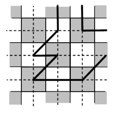 Решение 2:Рассмотрим новую квадратную сетку, образованную вертикальными и горизонтальные линиями, проходящими через центры клеток доски. Каждый квадрат этой сетки разрежем диагоналями на четыре треугольника. Очевидно, каждый получившийся треугольник наполовину белый, а наполовину – чёрный. С другой стороны, фигура, ограниченная ломаной, состоит из таких треугольников, поскольку по условию она ни одного из них не пересекает.