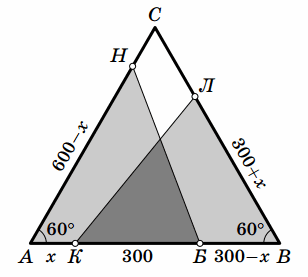 АН = 900 – AБ = 600 – x. Осталось заметить, что треугольники АНБ и ВКЛ равны по углу и двум прилежащим к нему сторонам (AБ = 300 + x = BЛ,