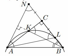 Так как четырёхугольник ABLK вписан, ∠CKB = 180° – ∠ALB = ∠ALC (рис. слева). С другой стороны, прямоугольные треугольники ACL и ACN равны по двум катетам, так что ∠ANC = ∠ALC = ∠CKB = 90° – ½ ∠B. Тогда из треугольника ABN имеем