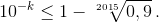 Тогда неравенство 0,9 ≤ (1 – 10–k)2015 ≤ (1 – 10–k)n < 1 выполнено при всех n ≤ 2015. Умножая на 10kn, получим 0,9·10kn ≤ (10k – 1)n < 10kn. Это значит, что при x = 10k – 1 все числа вида xn, где n = 1, 2, ..., 2015, начинаются с девятки.