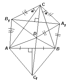 Следовательно, ∠ADC1 = ∠BDC1= 90° – α, то есть DC1 – биссектриса угла АDВ. Точка С1 пересечения биссектрисы треугольника АDВ и серединного перпендикуляра к стороне АВ лежит на описанной окружности этого треугольника. Таким образом, ∠АС1В = 180° – ∠АDВ = 2α.