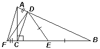 На продолжении катета ВС за точку С отложим отрезок CF = DA (см. рис.). Тогда ВА = BF, значит, ∠ ВАF = ∠ВFА. Следовательно, равны треугольники DАF и СFА (по двум сторонам и углу между ними), поэтому DF = CA. Тогда равны и треугольники BDF и АСВ (по трём сторонам). Значит, ∠BDF = ∠АСВ = 90°. Из равенства DE = BE следует, что DE – медиана прямоугольного треугольника BDF, проведённая к гипотенузе, то есть DE = BE = FЕ = FC + CE = AD + CE.