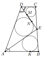 В трапеции ABCD биссектрисы углов A и D пересекаются в точке E, лежащей на боковой стороне BC. Эти биссектрисы разбивают трапецию на три треугольника, в которые вписали окружности. Одна из этих окружностей касается основания AB в точке K, а две другие касаются биссектрисы DE в точках M и N. Докажите, что BK = MN.