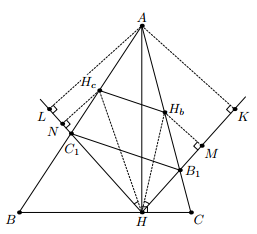 B1C1 || HbHc, то HcN : AL = HcC1 : AC1 = HbM : AK. Поскольку HA – биссектриса угла C1HB1, то AK = AL, поэтому HcN = HbM. Так как HA также биссектриса угла HcHHb, то ∠HcHN = ∠HbHM, следовательно, треугольники HHcN и HHbM равны. Таким образом, ортотреугольник треугольника ABC – равнобедренный, поэтому ABC – тоже равнобедренный. Противоречие.