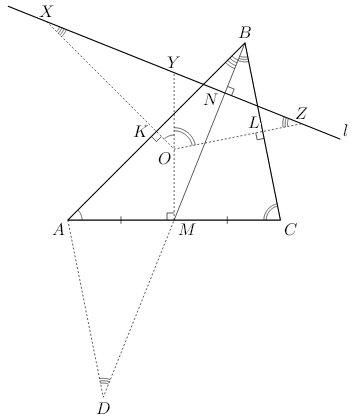 Пусть прямая l перпендикулярна медиане BM, а серединные перпендикуляры к сторонам AB, AC, BC пересекают l в точках X, Y и Z (см. рис.). Точки K, M, L – середины этих сторон, O – центр описанной окружности, N – точка пересечения l и BM. Из перпендикулярности прямых следует, что