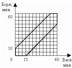 Аня, Боря и Вася решили пойти на "Ёлку". Они договорились встретиться на автобусной остановке, но не знают, кто во сколько придёт. Каждый из них может прийти в случайный момент времени с 15.00 до 16.00. Вася самый терпеливый из всех: если он придёт и на остановке не будет ни Ани, ни Бори, то он будет ждать кого-нибудь из них 15 минут, и если никого не дождётся, пойдёт на "Ёлку" один. Боря менее терпеливый: он будет ждать лишь 10 минут. Аня самая нетерпеливая: она вообще не будет ждать. Однако если Боря и Вася встретятся, то они будут ждать Аню до 16.00. Какова вероятность того, что на "Ёлку" они пойдут все вместе?