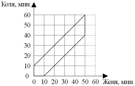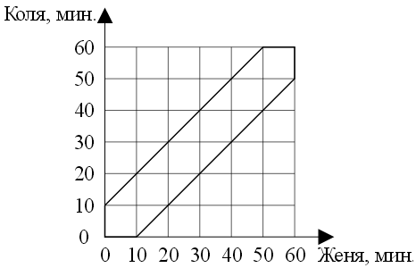 а) Изобразим графически времена прихода. Время прихода Жени будем откладывать по оси Х, а время прихода Коли – по оси Y.