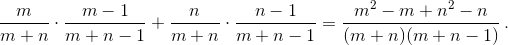 Пусть в ящике m + n носков, из которых m одного цвета и n другого. Тогда вероятность вытащить два носка одного цвета равна сумме вероятностей вытащить два носка первого и второго цветов: