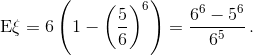 ξ = ξ1 + ... + ξ6. Переходя к ожиданиям получим: Eξ = 6Eξ1, поскольку все величины ξi распределены одинаково. Математическое ожидание Eξ1, очевидно, равно P(ξ1 = 1) = 1 – (⅚)6.