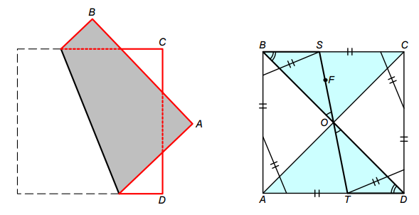 Развернём красивый сгиб (рис. справа). Пусть диагональ BD и линия сгиба ST пересекаются в точке O. Треугольники BSO и DTO равны по стороне и двум углам. Значит, BO = OD, и поэтому O – центр квадрата. Таким образом, линия сгиба ST проходит через центр квадрата. Очевидно, обратное также верно – если линия сгиба проходит через центр квадрата, то сгиб будет красивым.