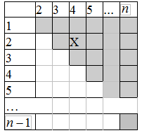 Удобно составить треугольную таблицу. Закрашенные ячейки соответствуют парам любимых носков. Например, пара (2, 4), помеченная знаком "Х", соответствует случаю, когда первый любимый носок попался вторым, а второй – четвёртым по счету. Все пары равновозможны, а общее