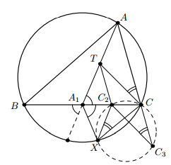 Пусть T – середина AA1. Тогда XC2 и CT – соответственные медианы в подобных треугольниках, откуда ∠CXC2 = ∠ACT (рис. слева). С другой стороны, CTC2C3 – параллелограмм, так что ∠CC3C2 = ∠ACT = ∠CXC2. Это значит, что X лежит на описанной окружности треугольника CC2C3.