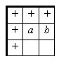 Меняя, если нужно, знаки в столбцах, заполним плюсами верхнюю строку. Затем действуя со строчками, заполним плюсами левый столбец (при этом верхняя строка не "испортится"). Докажем,что теперь во всей таблице стоят плюсы. Рассмотрим левый верхний квадрат 2×2 (см. рис.). В нём уже стоят три плюса. Значит и в клетке a стоит плюс. Теперь, рассмотрев соседний квадрат 2×2, видим, что и в клетке b стоит плюс. Продолжая, докажем это для всех клеток второй строки. Теперь повторяем рассуждение для третьей, затем четвёртой, ... и последней строк.