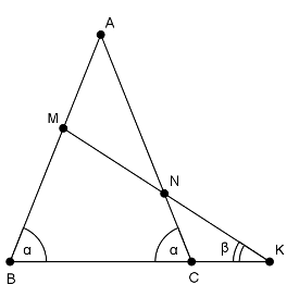 На сторонах АВ и АС равнобедренного треугольника АВС (АВ = АС) соответственно отмечены точки Ми N так, что АN > AM. Прямые MN и ВС пересекаются в точке K. Сравните длины отрезков MK и MB.